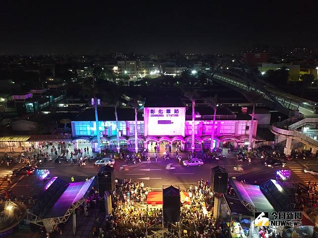 ▲驛光記憶-2018彰化驛光雕藝術饗宴在彰化火車站廣場璀璨閃耀,光影交疊的視覺震撼,呈現震撼耀眼的光影秀。(圖/記者陳雅芳攝,2018.10.14)