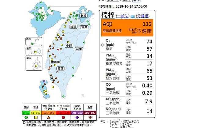 空監網指出,由於東北季風影響,中部、雲嘉南及高屏空品區位於下風區擴散較差,麥寮、台西、朴子、新營、台南、橋頭、鳳山、大寮、楠梓、前金及前鎮等為「橘色提醒」等級,竹苗、中部空品區、澎湖及金門為「普通」等級,北部、宜蘭、花東空品區及馬祖為「良好」等級。而15日東北風稍減弱,中部以南因為擴散條件較差,清晨及晚間易有污染物累積,加上中部空品區以南午後光化反應,易使臭氧濃度升高,高屏空品區局部區域可能達「紅色警示」等級。